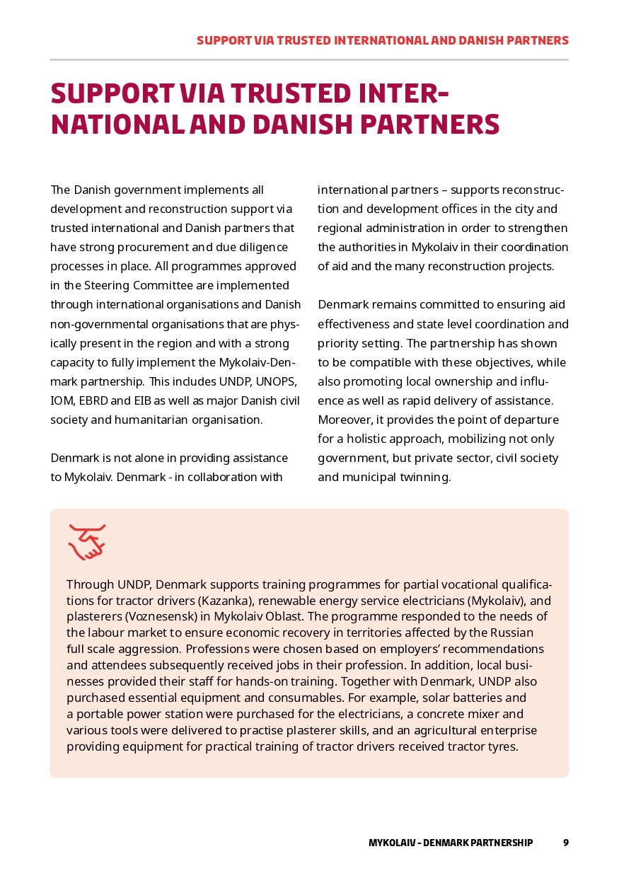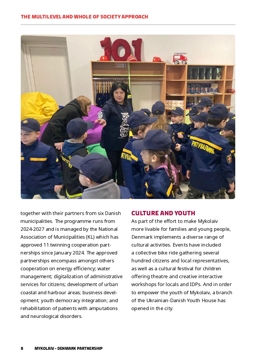 In parallel with Danish support on a national level, Denmark’s support for Ukraine’s reconstruction has a specific focus on Mykolaiv city and region. This paper gives an overview of the Mykolaiv-Denmark Partnership and how this model is applied locally. As of June 2024, the Danish Government has delivered approx. EUR 142.8 million which includes social infrastructure, water, energy, psycho-social support and much more.