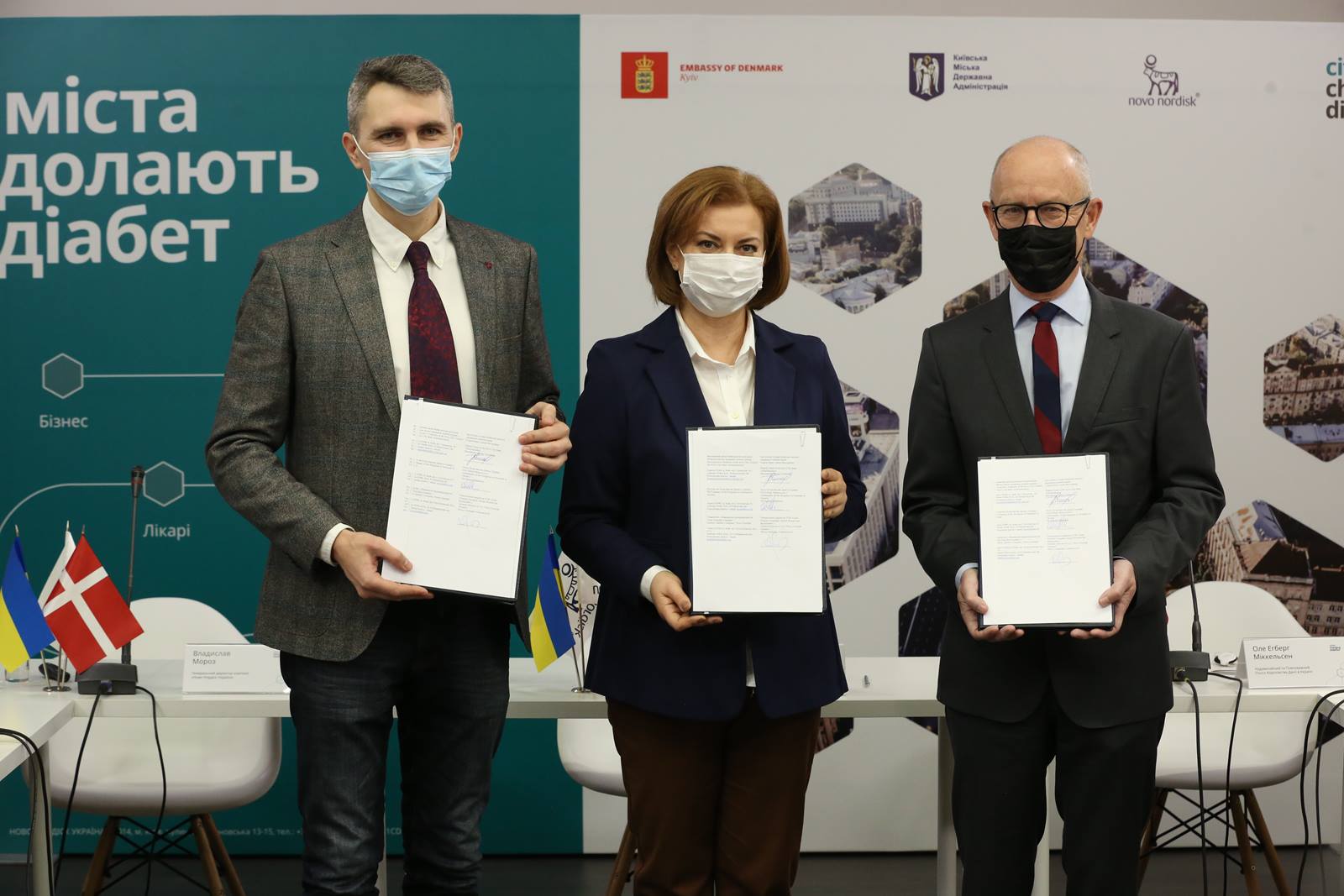 Today, the Ambassador of Kingdom of Denmark Ole Egberg Mikkelsen, the Deputy Chairwoman of the Kyiv City State Administration Hanna Starostenko and the General Director of Novo Nordisk Ukraine Vladyslav Moroz signed a Protocol on Cooperation in Combating Diabetes in Kyiv.